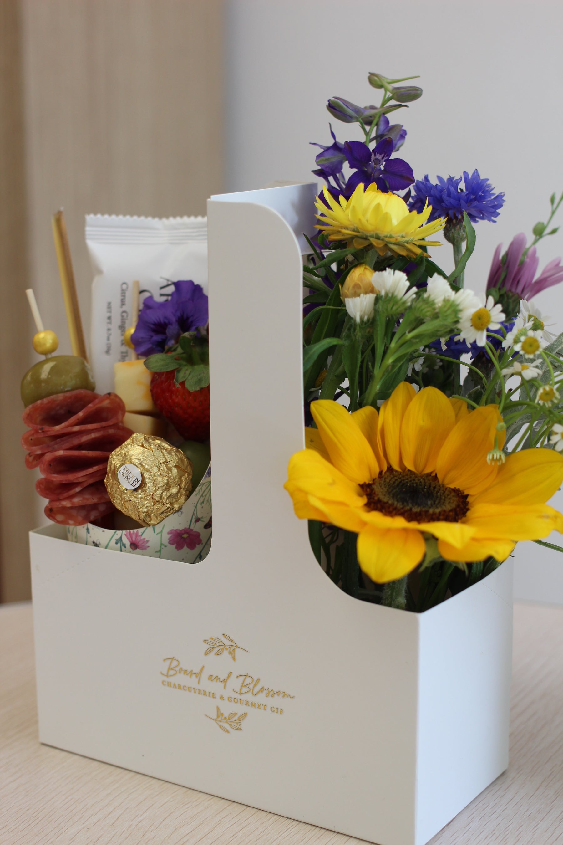 Our viral-style charcuterie cup and floral bouquet, beautifully presented in a branded carrier.