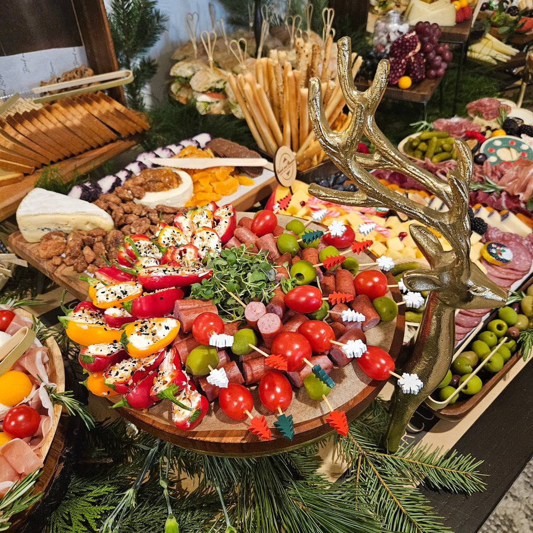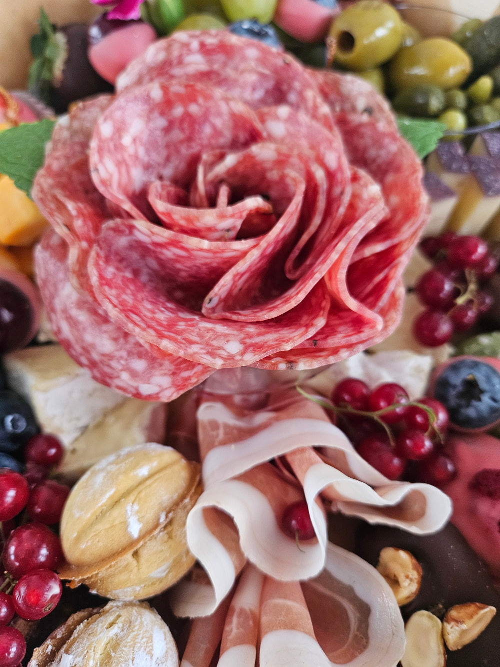 Our viral-style charcuterie cup and floral bouquet, beautifully presented in a branded carrier.