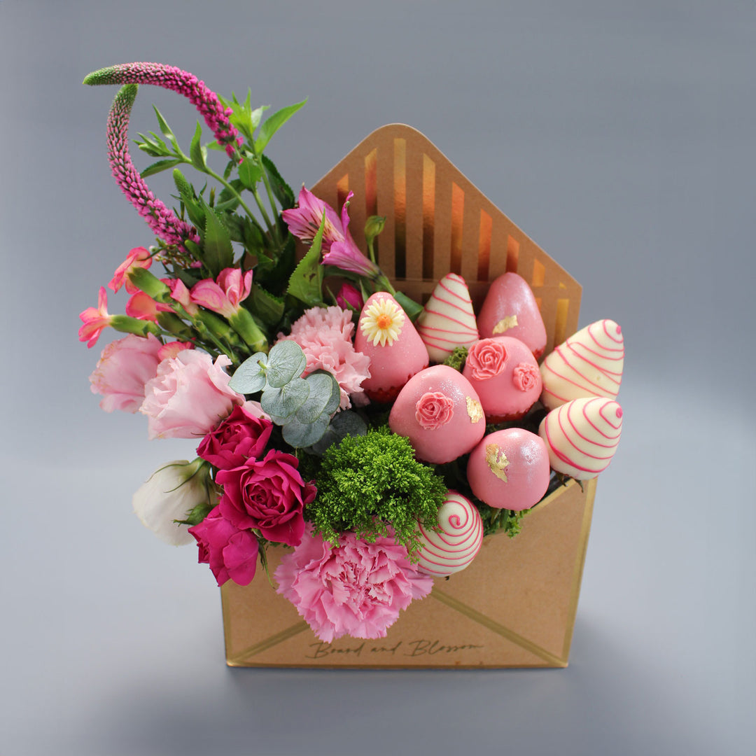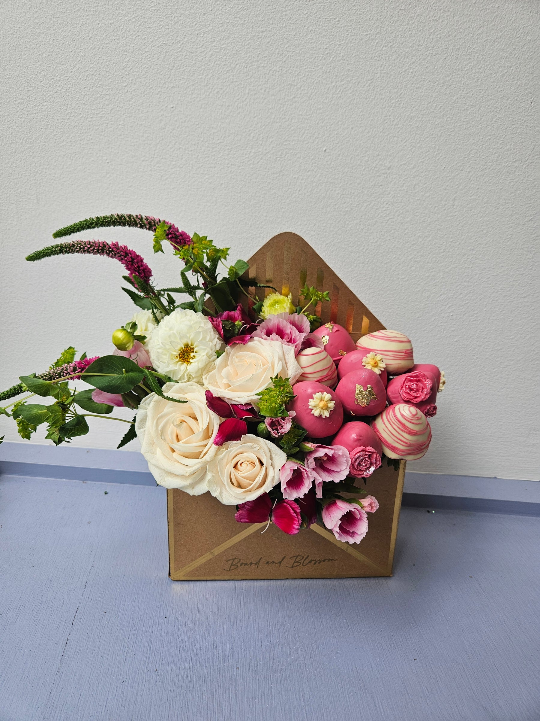 Express your deepest sentiments with our Heartfelt Message arrangement, a stunning combination of vibrant blooms and chocolate-dipped strawberries. This exquisite piece features a selection of fresh, seasonal flowers paired with beautifully hand-dipped strawberries. Perfect for expressing love, appreciation, or well wishes, this arrangement is crafted to convey warmth and affection on any special occasion.